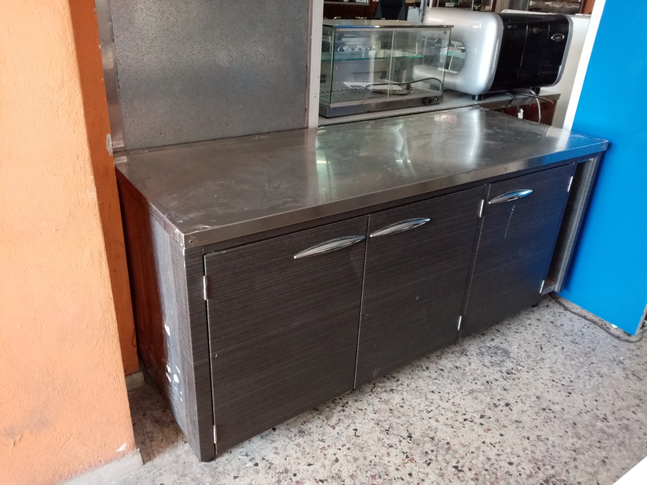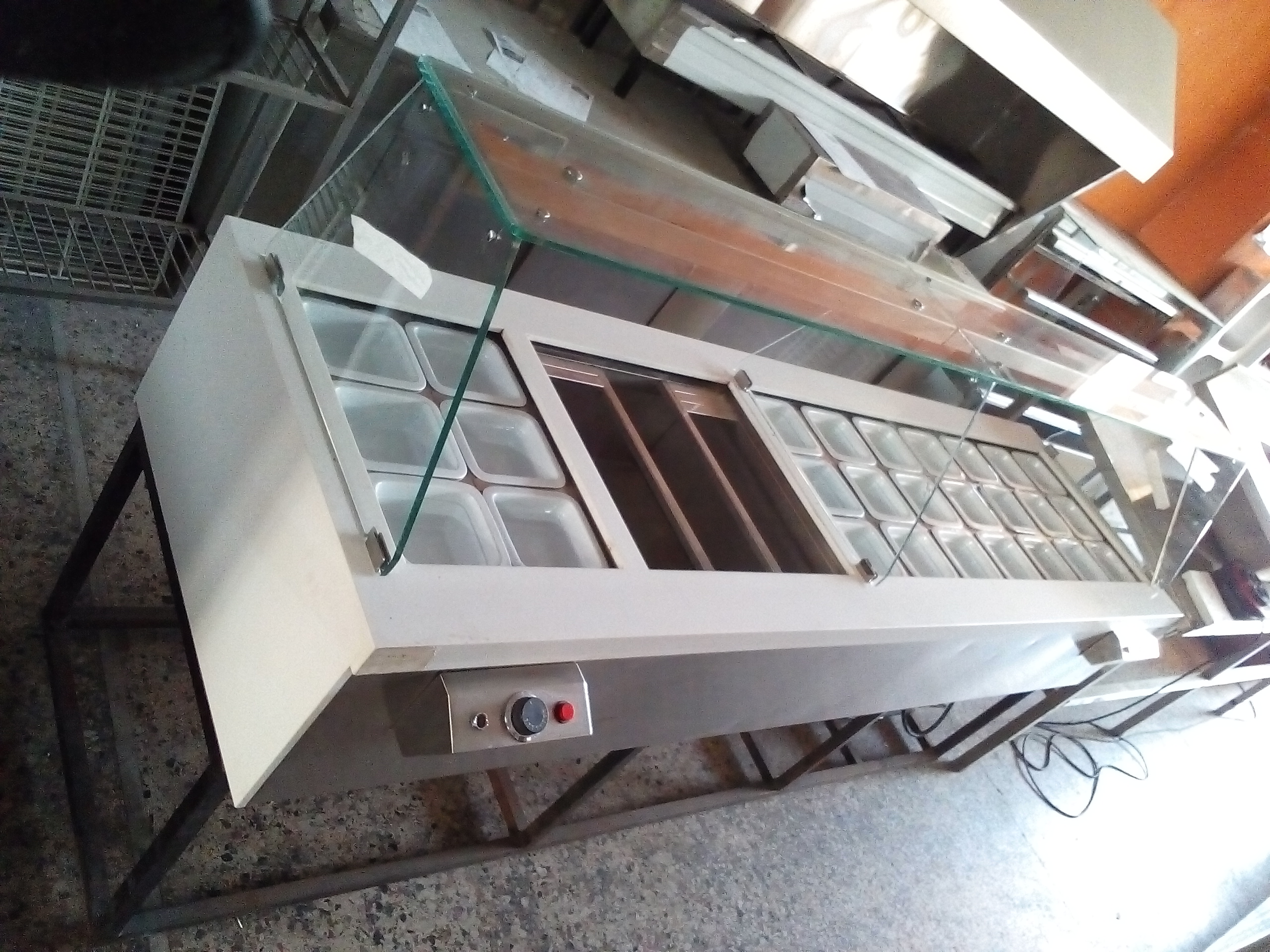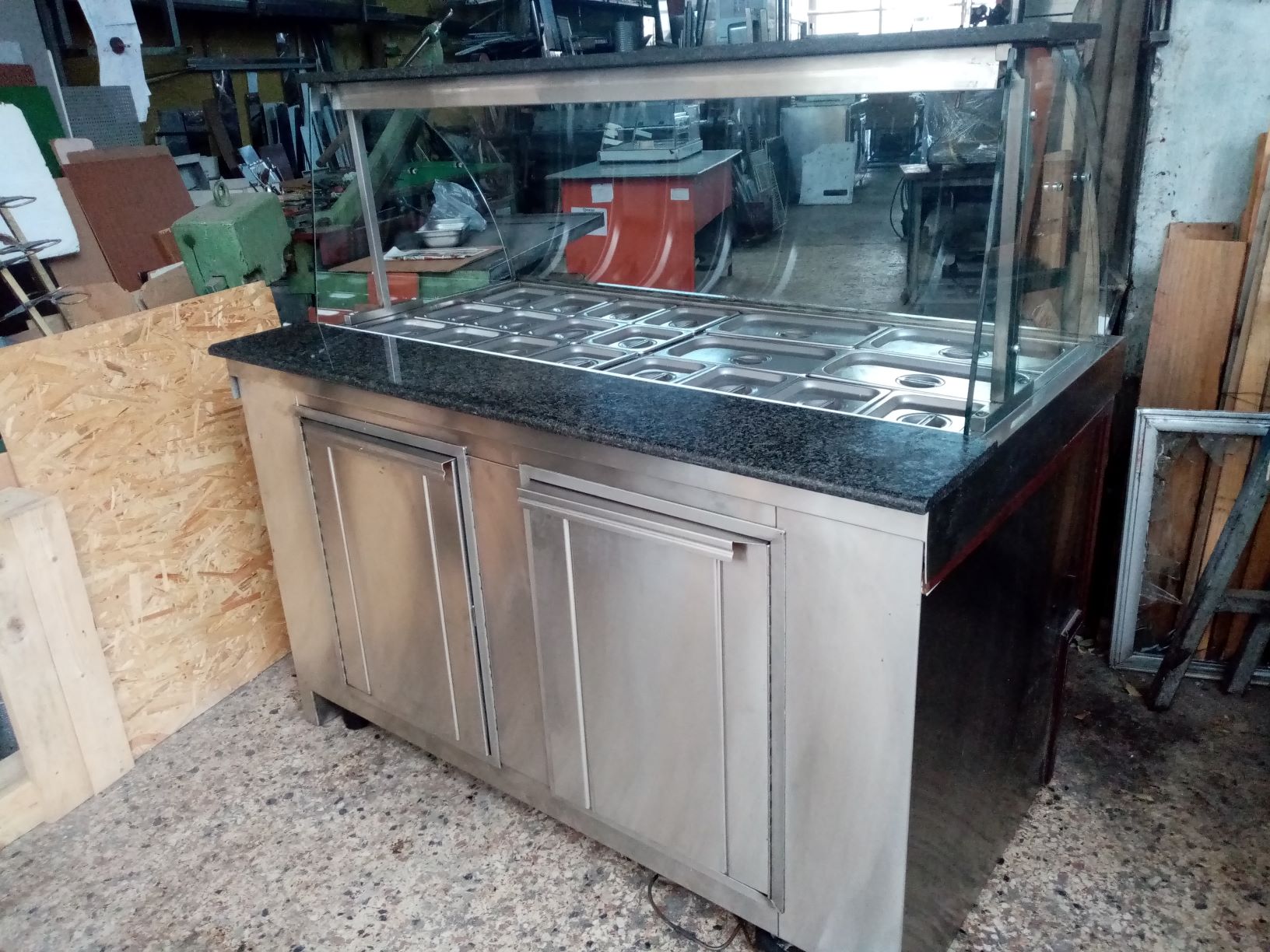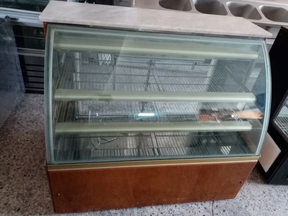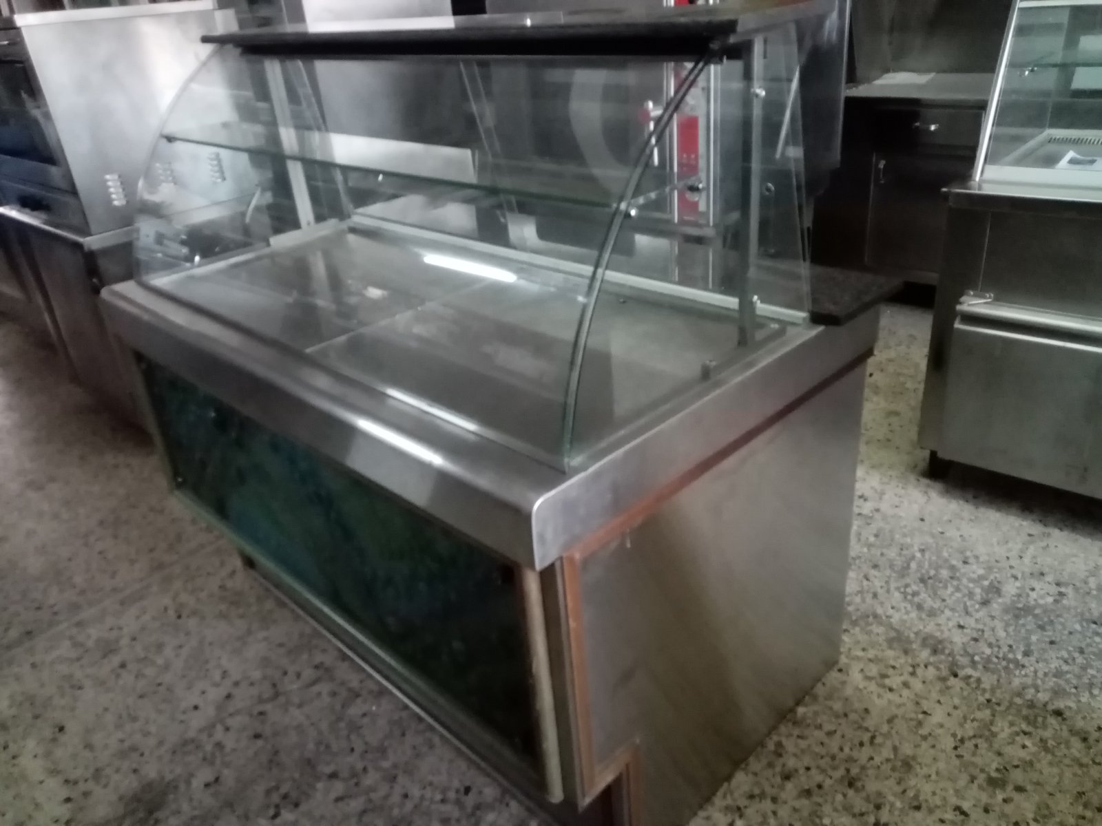 Βιτρίνα θερμαινόμενη με θερμοθαλαμο στο κάτω μέρος, με φωτισμό,με γρανιτη στο πανω και στο πισω μερος του παγκου, με σχαρα και ραφι,και διακοσμηση μπροστα. Ειναι ειδική κατασκευή.Διαστασεις 143χ90χ136